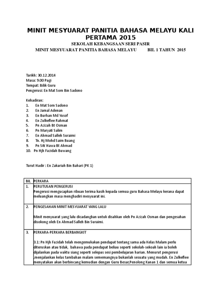Minit Mesyuarat Panitia Bahasa Melayu Kali Pertama 2015 Pdf